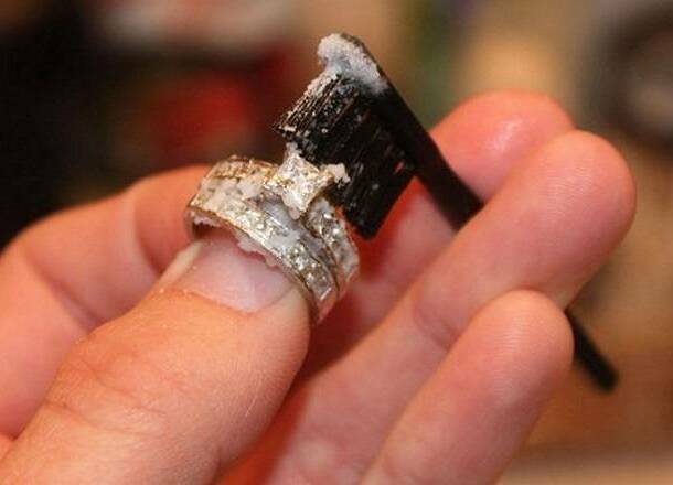 Снимайте украшения и при употреблении косметических средств, приготовленных на основе солей ртути и серы (ртуть образует с золотом амальгаму, отчего изделие покрывается белыми пятнами, а сера легко образует с золотом и серебром сернистые соединения черного цвета).